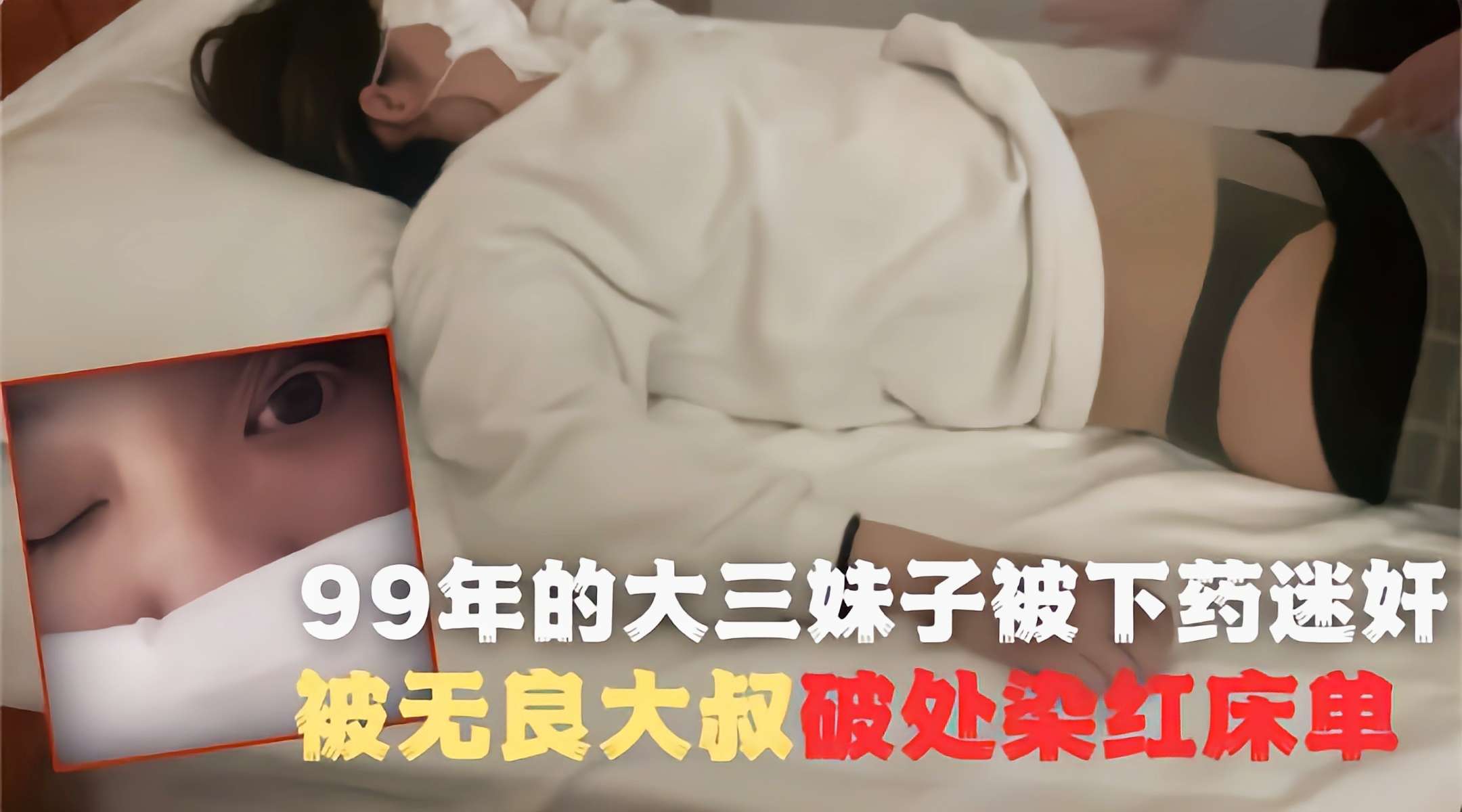 99年的大三妹子被下药迷奸被无良大叔破处染红床单